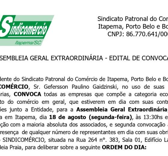 O Sindicato Patronal do Comércio de Itapema, Porto Belo e Bombinhas – SINDICOMÉRCIO, por meio de seu presidente, Sr. Gefersson Paulino...